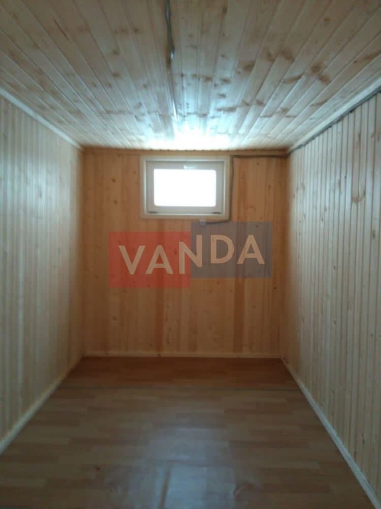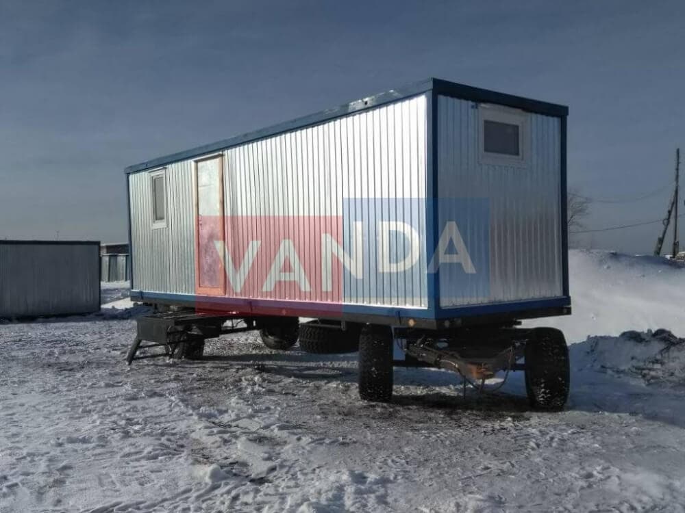 Контейнер на колесах состоит из металлического каркаса, который выполнен из профиля и укреплен сварным швом. Крыша покрыта листовым холоднокатанным окрашенным сварным металлом. Внешняя сторона стен обшита оцинкованным профнастилом. Внутренний каркас вагончика изготовлен из бруса. По всему периметру помещение утеплено и пароизолировано. Внутренняя отделка осуществляется по выбору заказчика. Это может быть вагонка или оргалитовые листы. Пол вагончика состоит из обрезной доски, пароизоляции, утепления поверх которого уложены ДСП. Вагончик оборудован дверью из оргалита и деревянными окнами с двойным остеклением.